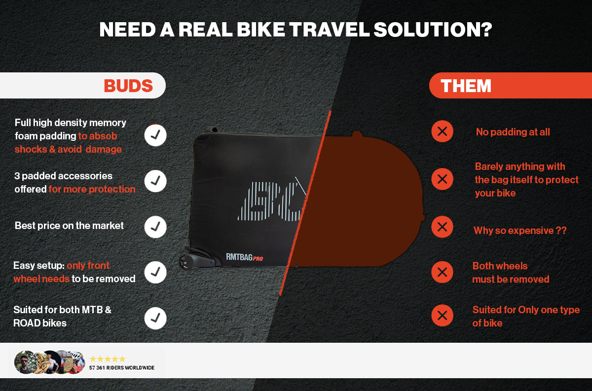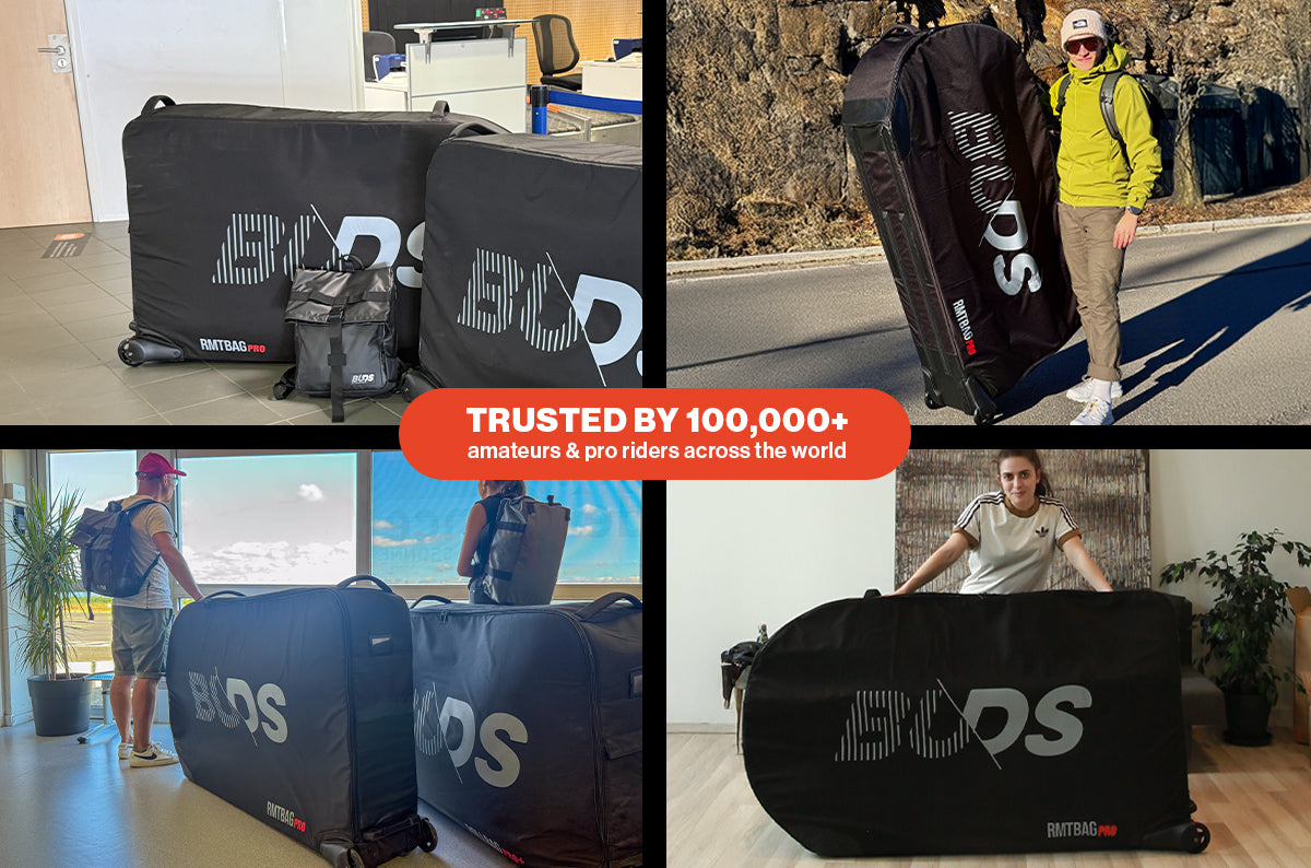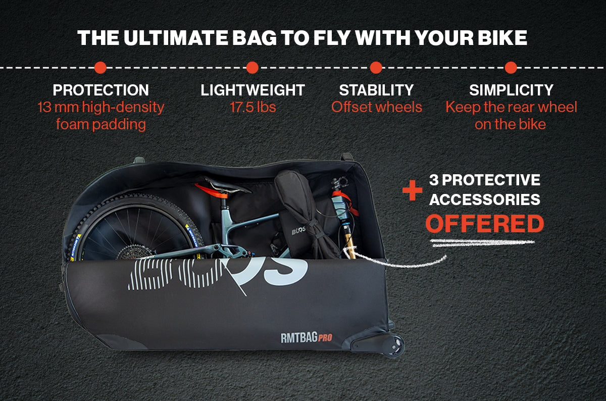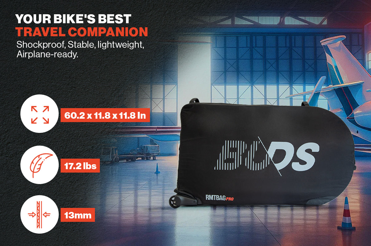 Die neue gepolsterte Tasche RMTBAG PRO 2026 ist die einzige Tasche, die speziell dafür entwickelt wurde, den Transport Ihres Straßen- und MTB bis 29" im Flugzeug zu erleichtern, ohne das Hinterrad auszubauen.