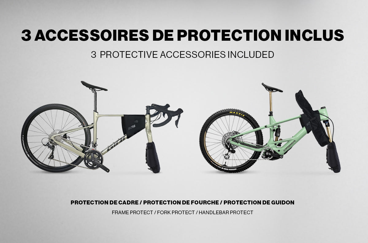 - FRAME PROTECT: Eine gepolsterte Hülle, die deinen Rahmen vor Stößen und Kratzern schützen soll.